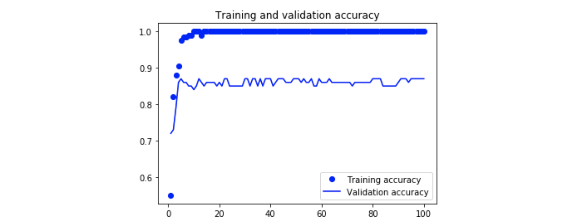 모델은 거의 과적합이 되었습니다. 과적합이 되지 않고서야 학습 데이터에 대한 정확도가 항상 1.0이 나오지 않으니까요!
