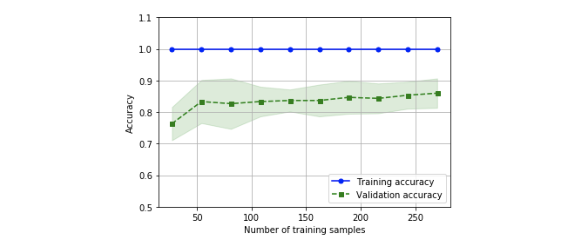모델의 정확도는 일반적으로 훈련 데이터 샘플의 수가 늘어남에 따라 커져야 합니다. 하지만, 그래프에는 이러한 양상이 나타나지 않습니다. 이는 아마 과적합이 되었기 때문일 것입니다. 데이터셋을 더 늘렸을 때 모델이 어떻게 반응하는지를 확인해볼 필요가 있을 것 같습니다.