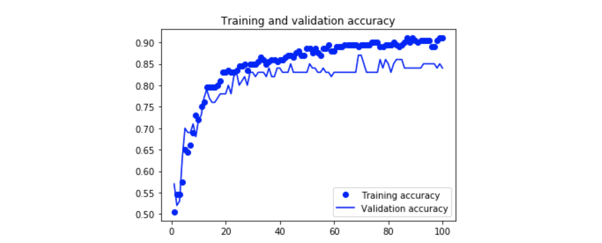 검증 데이터셋에 대한 정확도는 약 0.85로, 작은 데이터셋을 생각했을 때 나쁘지 않은 결과로 보입니다.