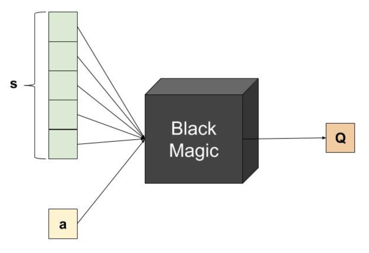 점점 구체적인 내용으로 들어가고 있는 것 같군요. 그렇다면 이제 모델의 구조에 대해서 한 번 확인해 보시죠. 단순히 위에서 봤던 Q-table에서 봤던 방식에 따른다면, 신경망은 현재 상태에 대한 정보와 현재 취할 행동, 두 가지를 입력받습니다. 그 후에는 모델 내에서 연산을 거쳐 Q-value를 출력하게 되죠. 다음과 같은 형태가 될 것 같습니다.