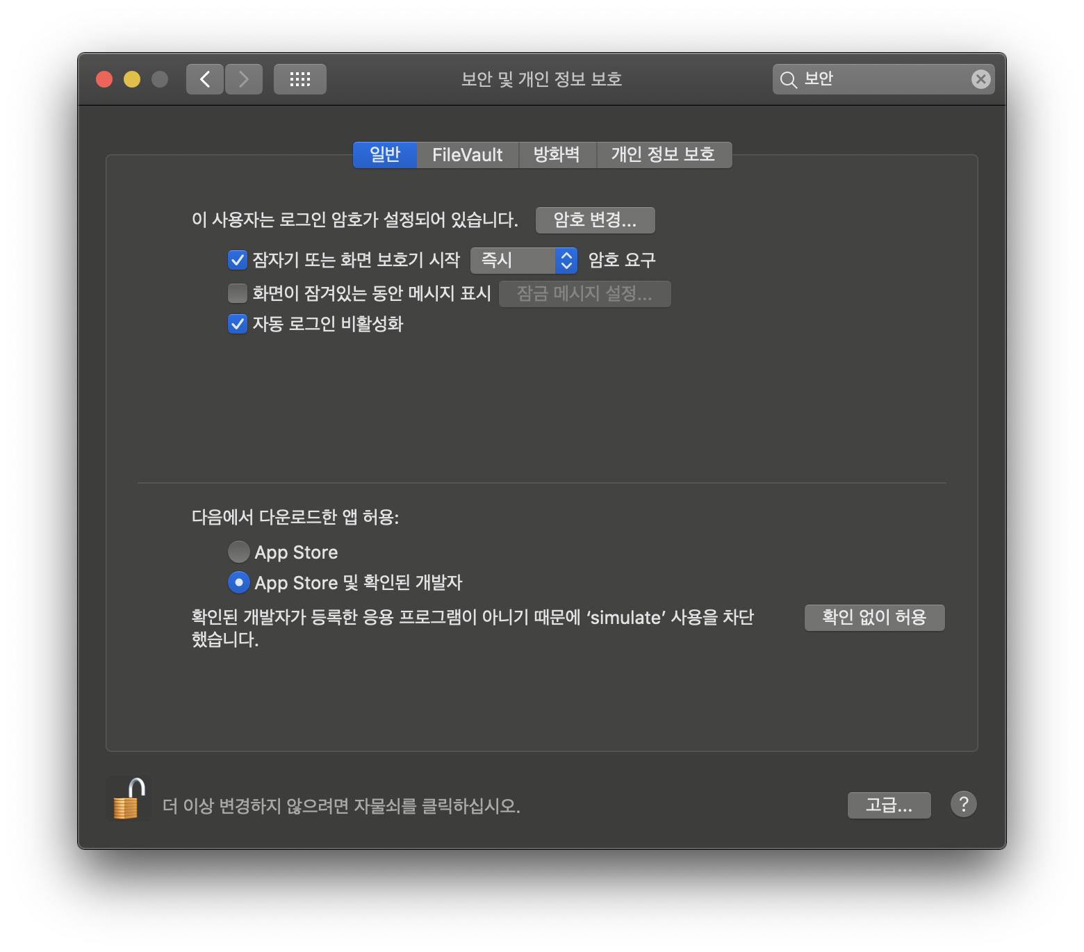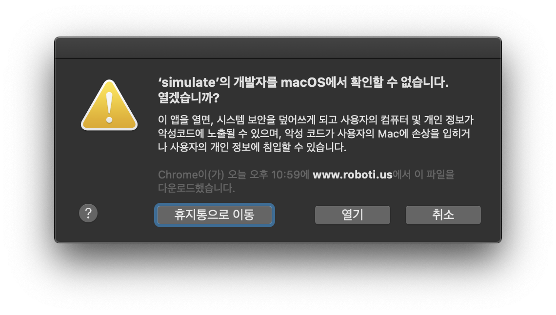- 중간에 mac에서 보안 문제로 다음과 같은 창이 뜰 경우,