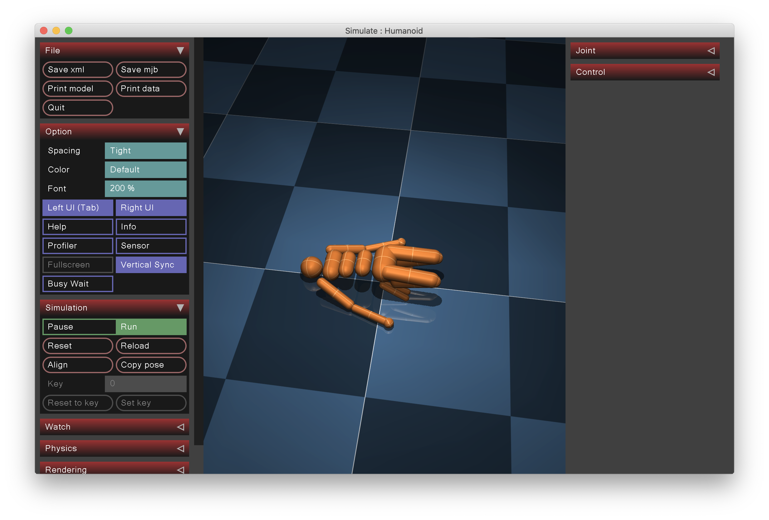 $ cd ~/.mujoco/mujoco200/bin$ ./simulate ../model/humanoid.xml
