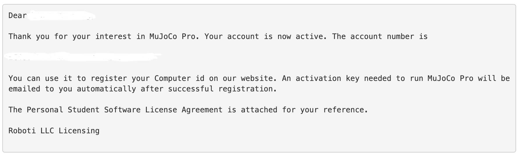 동시에 학교 메일로 "MuJoCo Pro Personal Account" 제목의 메일이 도착합니다. 메일에는 다음과 같이 제 Account Number가 적혀있습니다.
