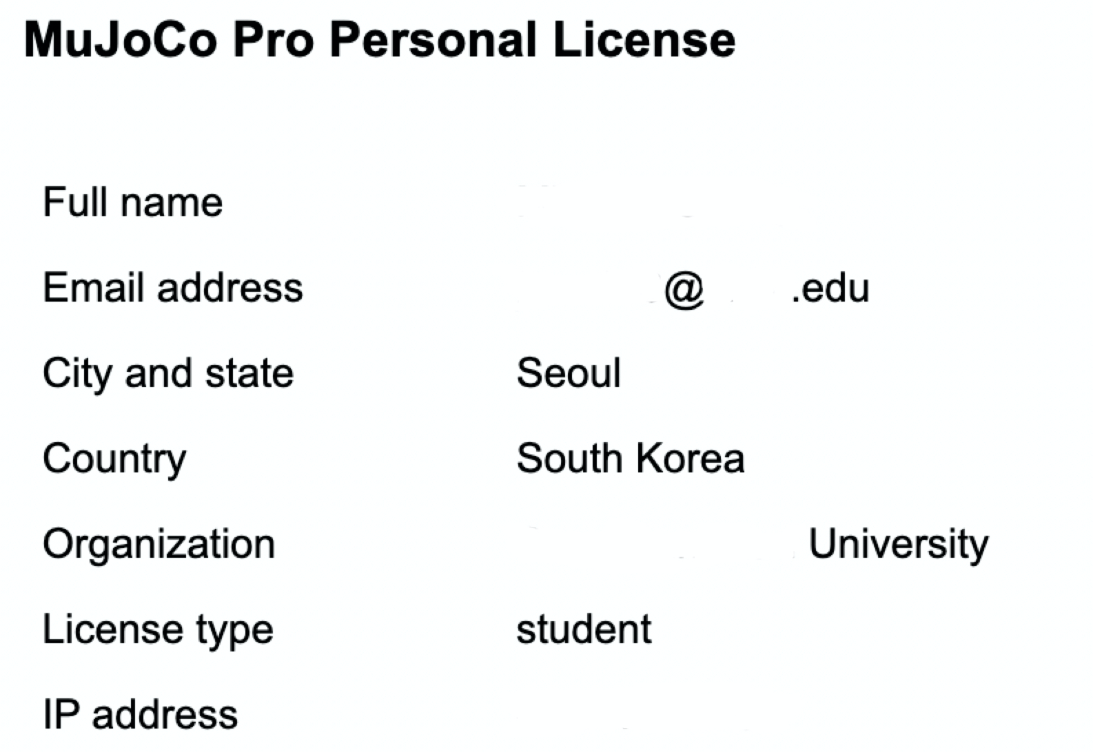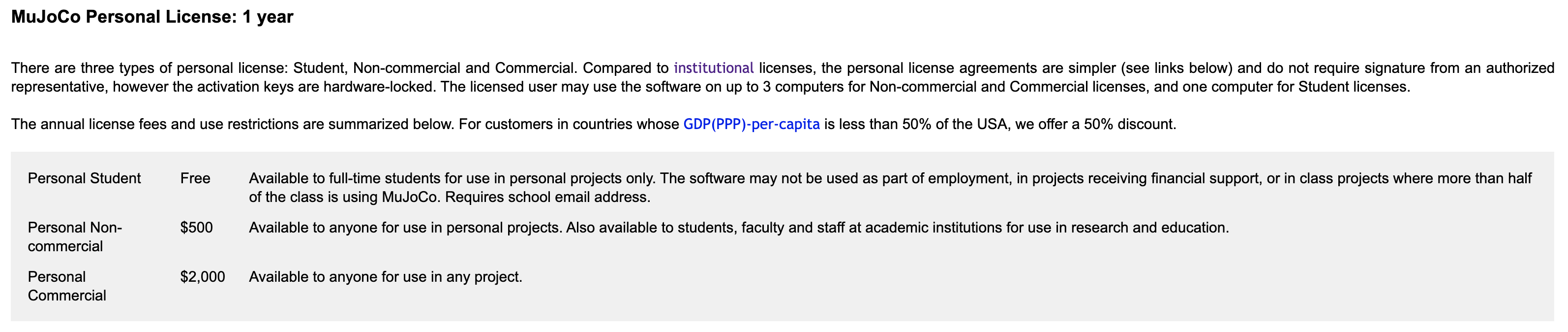학생 계정은 Mujoco 사이트의 "Personal - Student" 옵션에서 신청할 수 있습니다. 다만, 학교 계정으로 메일을 받을 수 있어야 가능합니다.
