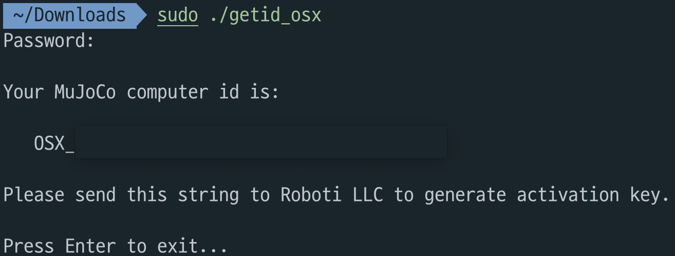 sudo명령어를 실행하기 위해 컴퓨터의 계정 비밀번호를 입력하게 하고, 잘 입력하고 나면 내 컴퓨터의 id를 알려줍니다.OSX_xxxxx와 같이 생긴 id를 잘 복사해서 Mujoco 사이트로 돌아가 Computer id 칸에 입력해줍니다.