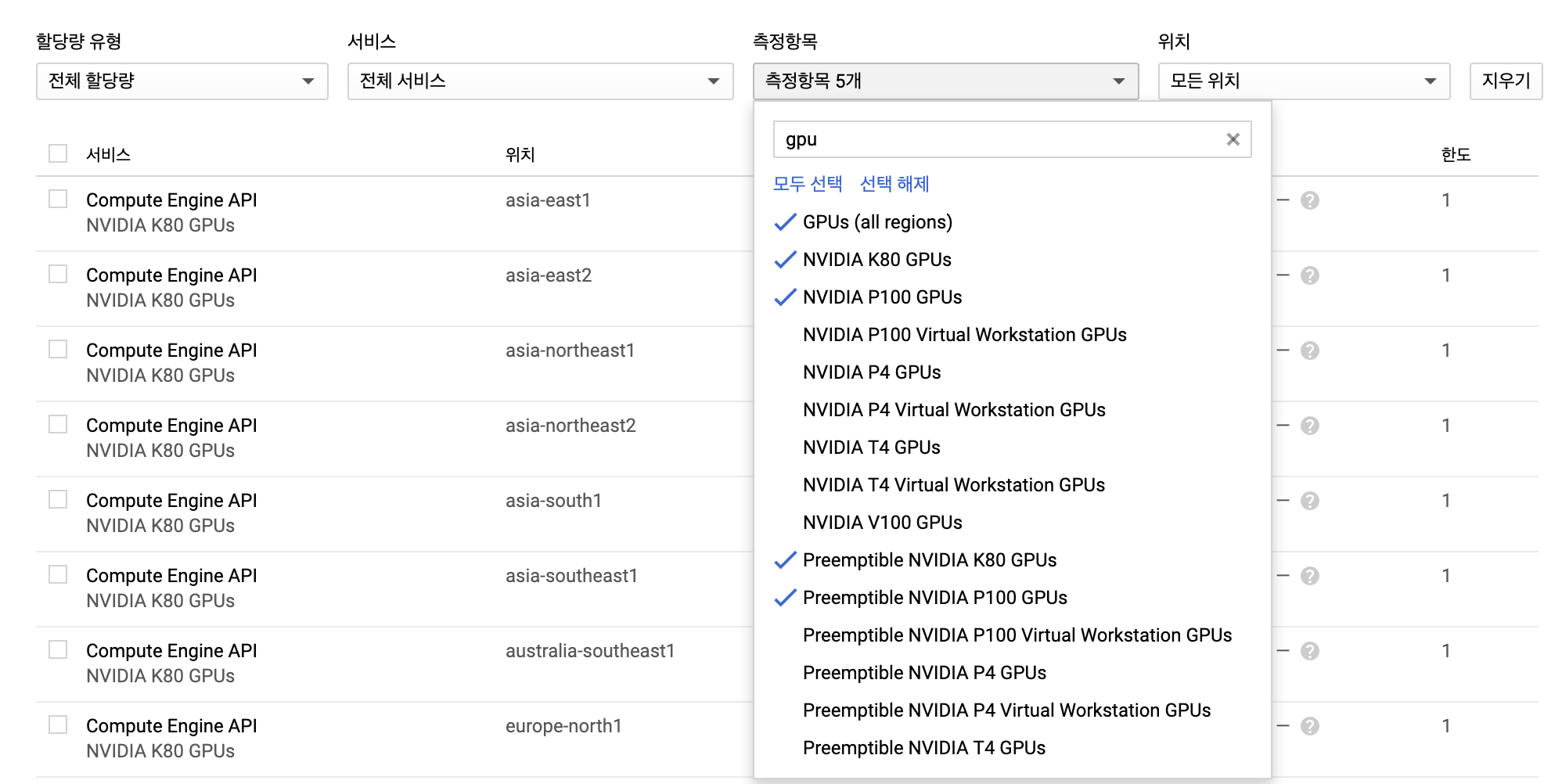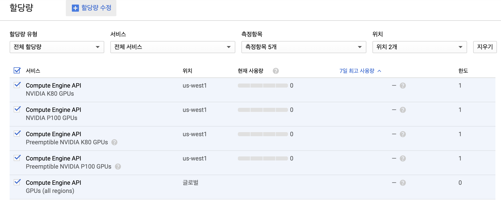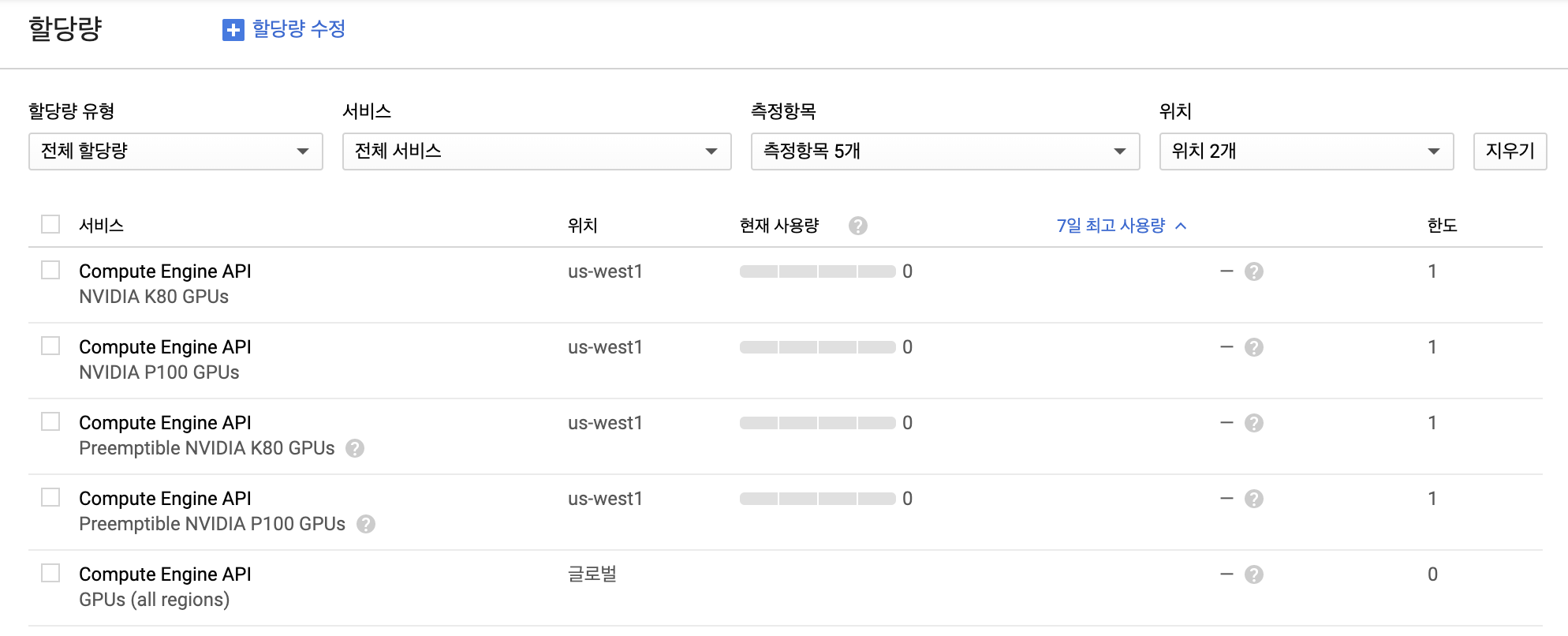 그 외의 GPU모델들은 기본 할당량이 1입니다. 즉, 1개까지는 할당량 신청 없이도 사용이 가능합니다.