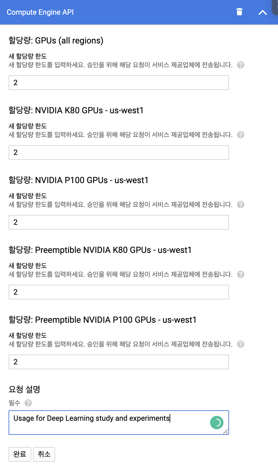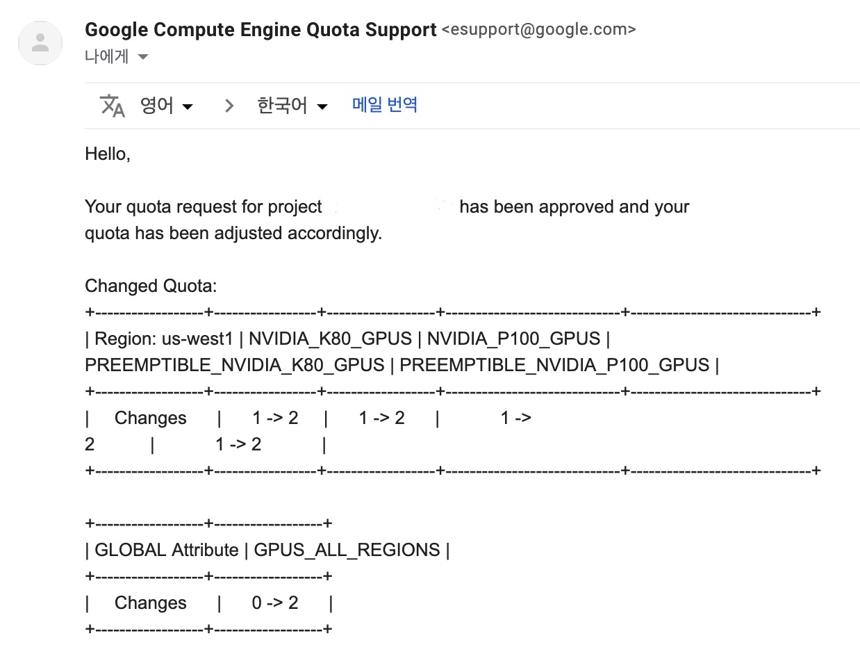 내 계정에 할당할 수 있는 GPU 개수를 증가시켜달라고 신청하는 건데, 신청을 올리면 직원들이 확인하고 직접 할당량을 증가시킨 후 메일이 오는 형태더라구요. 번거롭지만 무분별한 사용이나 할당을 방지하기 위한 장치인 것 같습니다.