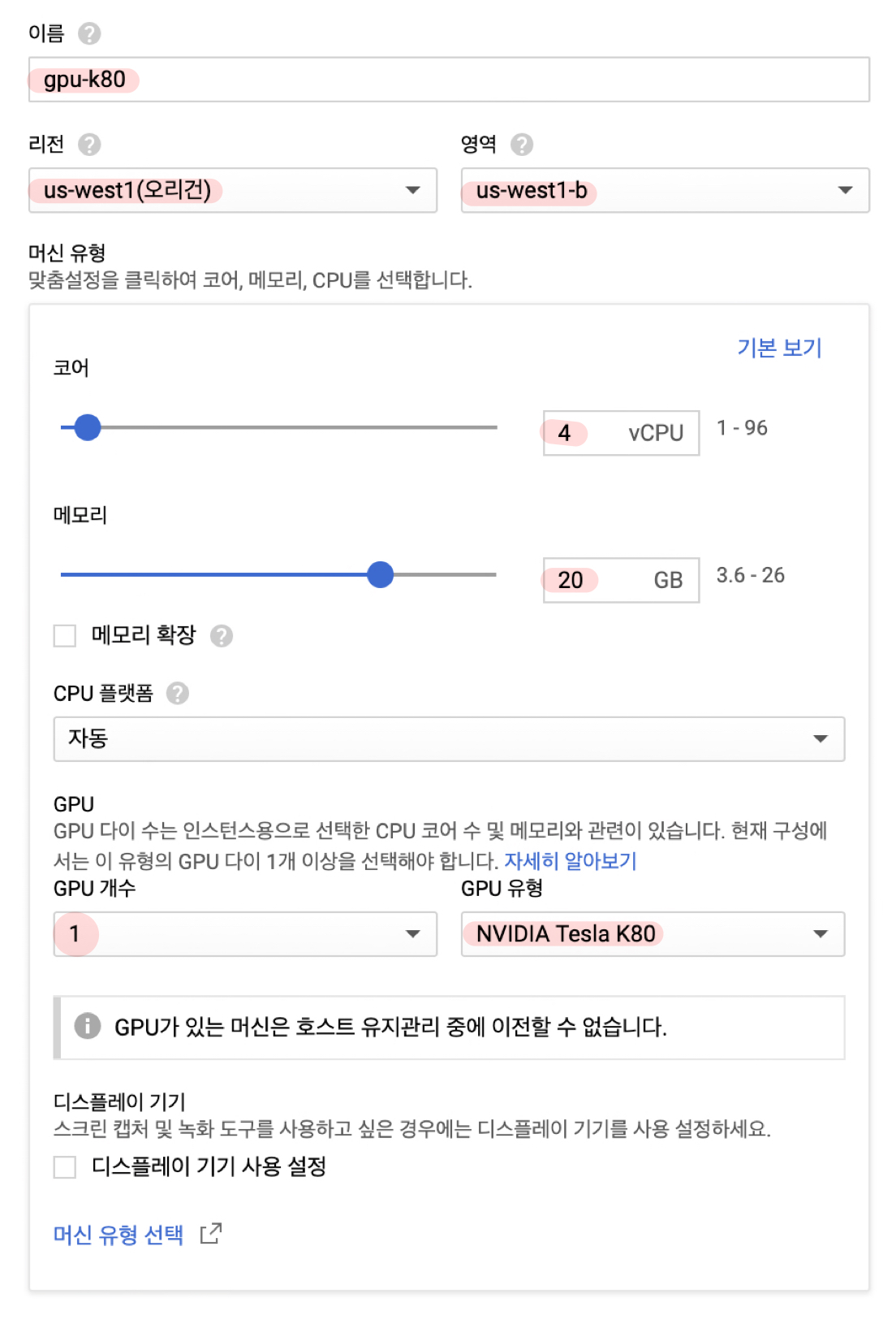 저는vCPU 4개,메모리 20GB로 설정하였습니다. - GPU는 할당받은 개수 내에서 원하는 만큼 사용하면 됩니다. K80을 한 개 사용해보겠습니다.