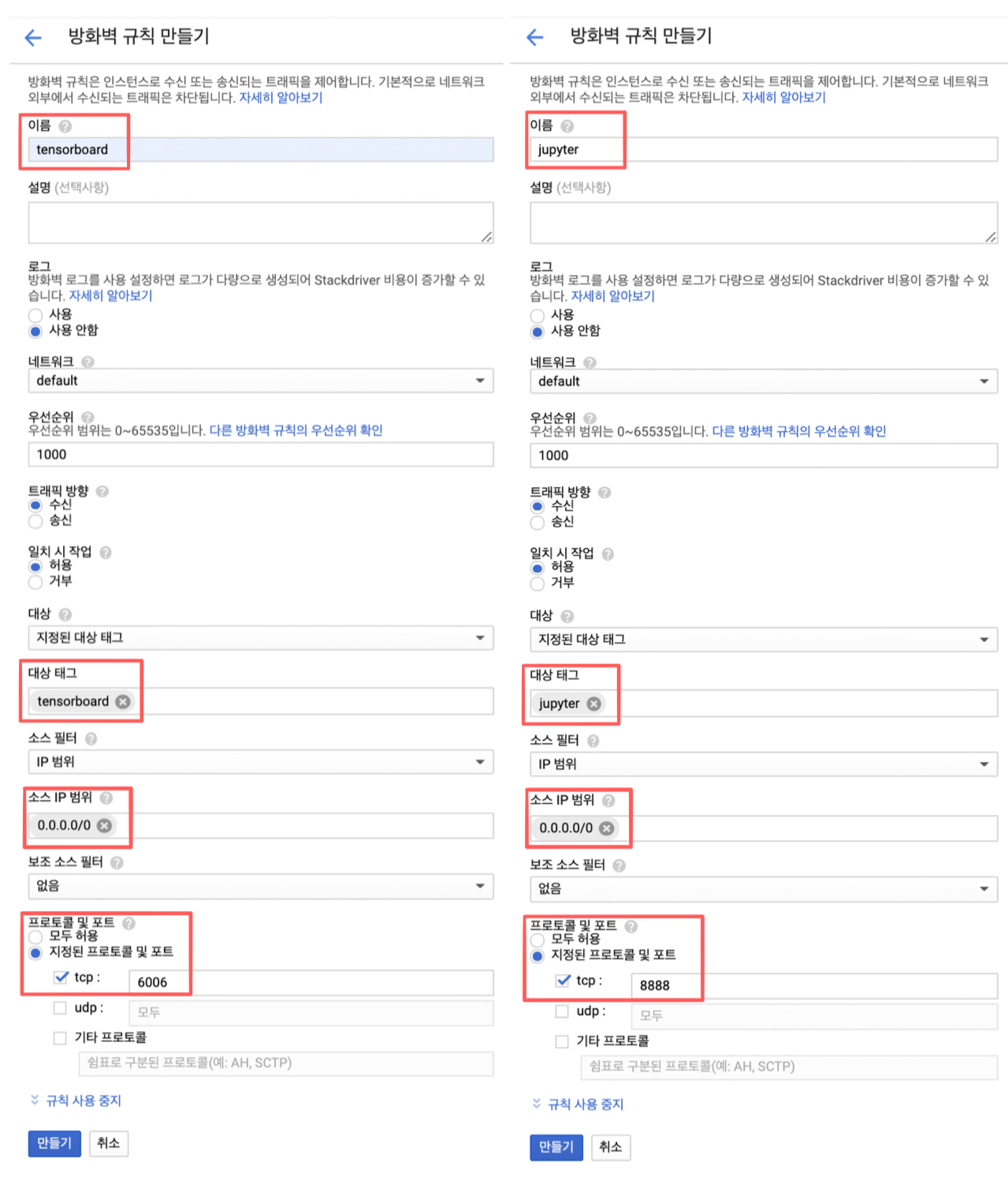 이름,대상 태그,소스 IP 범위, 그리고프로토콜 및 포트: tcp입니다.