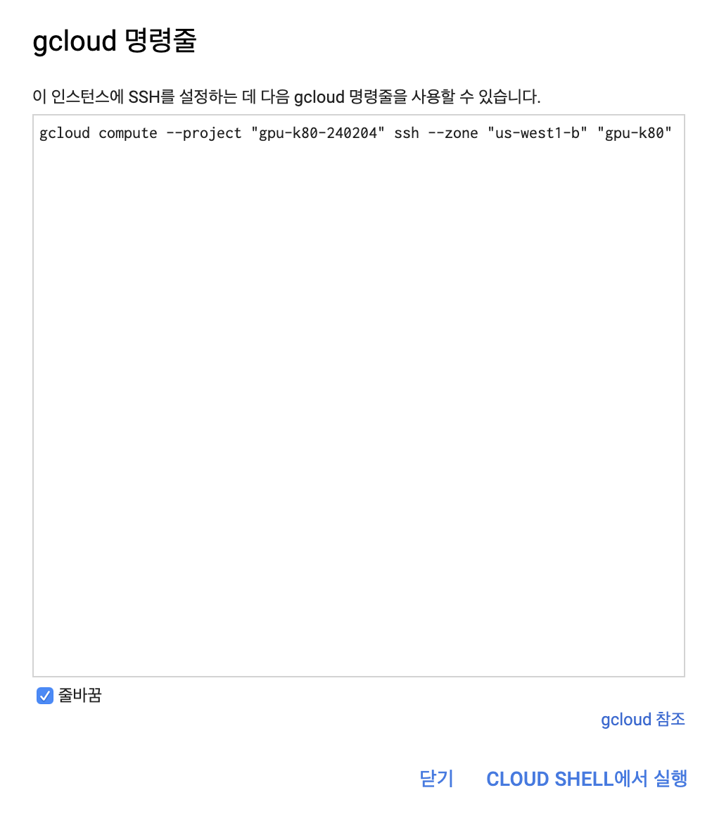 다시 GCP 페이지로 넘어가서 "gcloud 명령 보기"를 눌렀을 때 나오는 다음과 같은 명령어를 복사합니다.