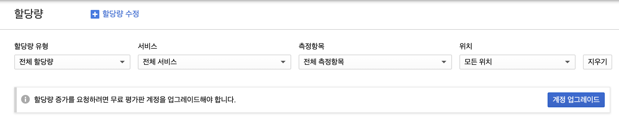 ㅤ - 여기서 할당량 증가를 요청하려면 계정을 업그레이드 해야한다고 뜹니다.