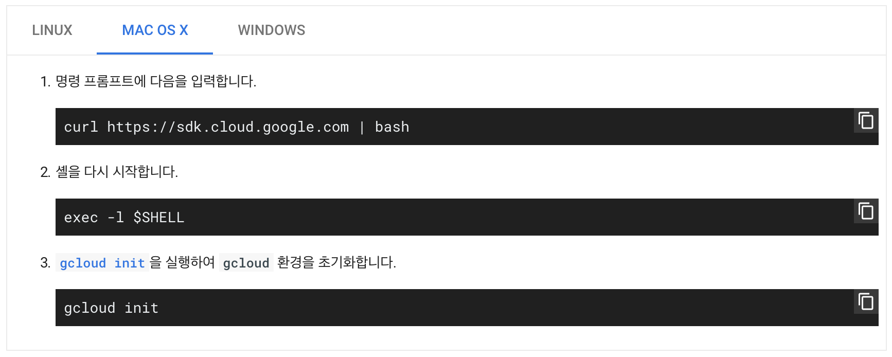 Google Cloud SDK 설치 방법은 SDK Document에 Mac / Windows / Ubuntu 등 다양한 OS별로 자세히 설명되어 있습니다.
