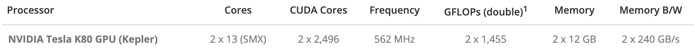 먼저 GCP에서 제공하는 대표적인 세 가지 GPU -K80,P100,V100의 스펙은 다음과 같습니다.