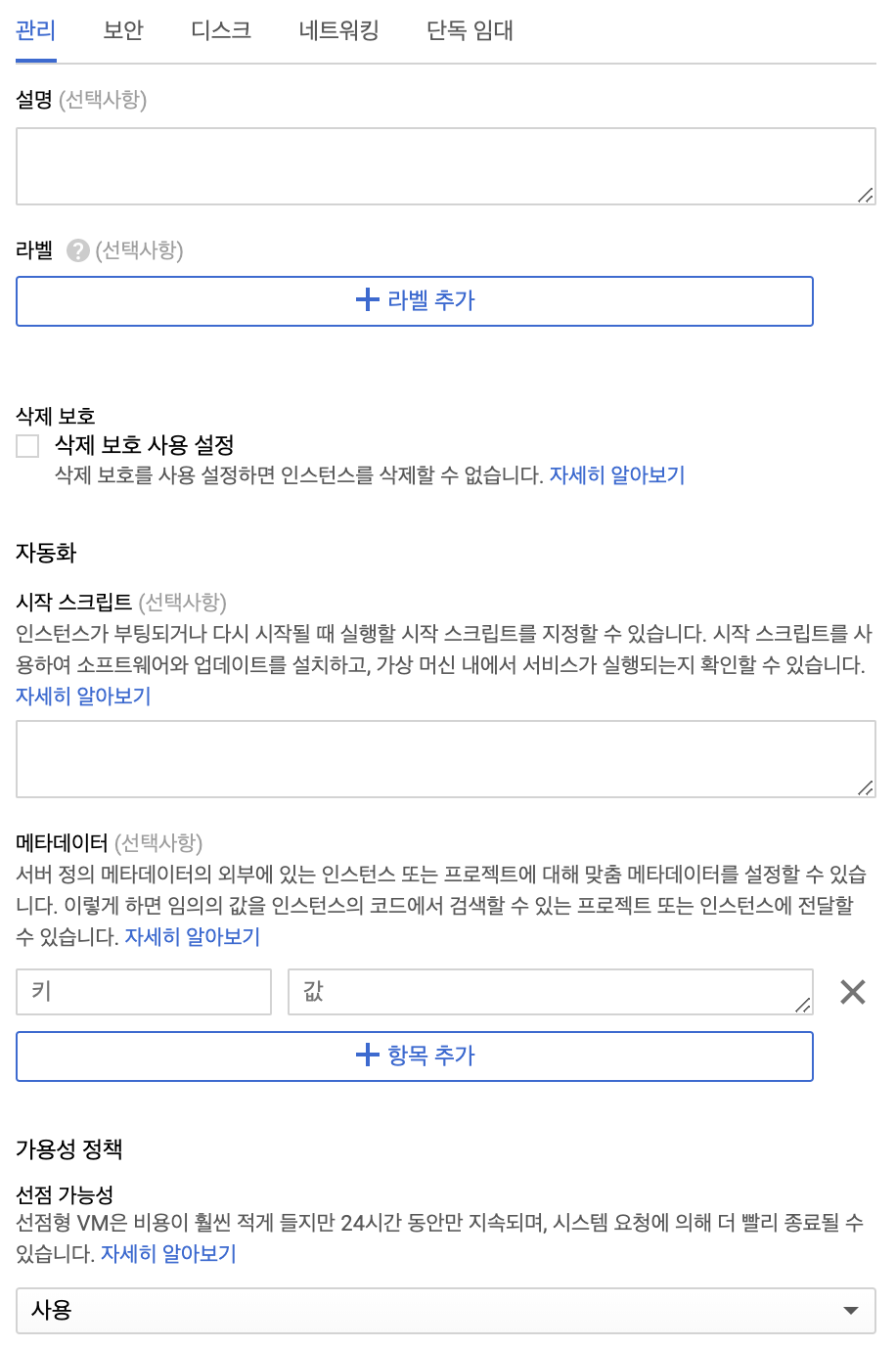 ㅤ - 마지막입니다! 선점형 인스턴스를 만들고 싶다면 '관리' 탭에서 '가용성 정책' > '선점 가능성' 을 "사용"으로 바꿔주면 됩니다.
