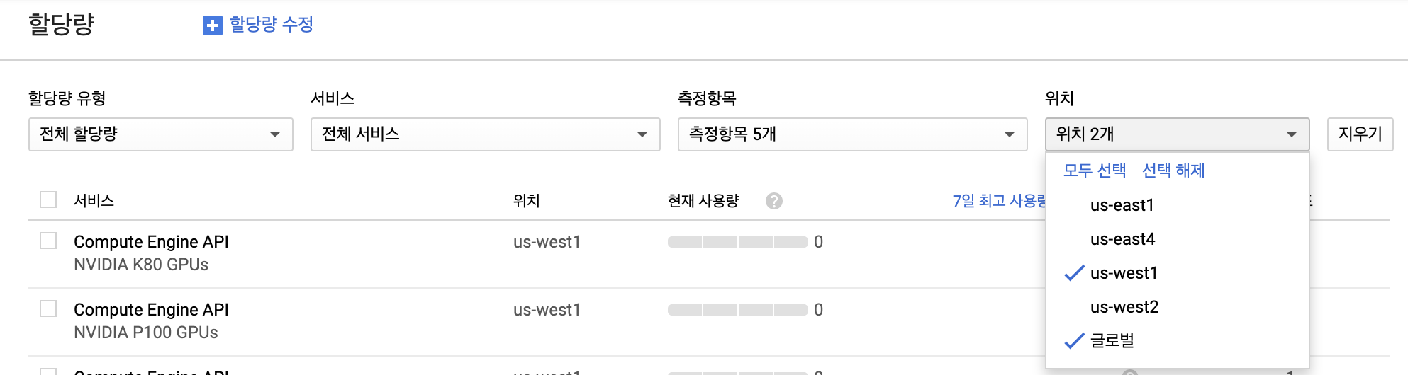ㅤ - 모두 선택을 해주고 위의 "할당량 수정"을 클릭합니다.