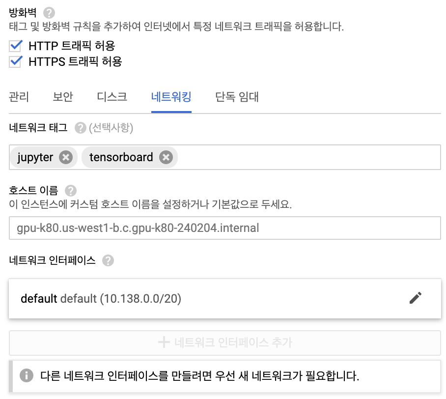 jupyter,tensorboard을 입력해 우리가 이미 만들어놓은 방화벽을 사용할 수 있도록 합니다.