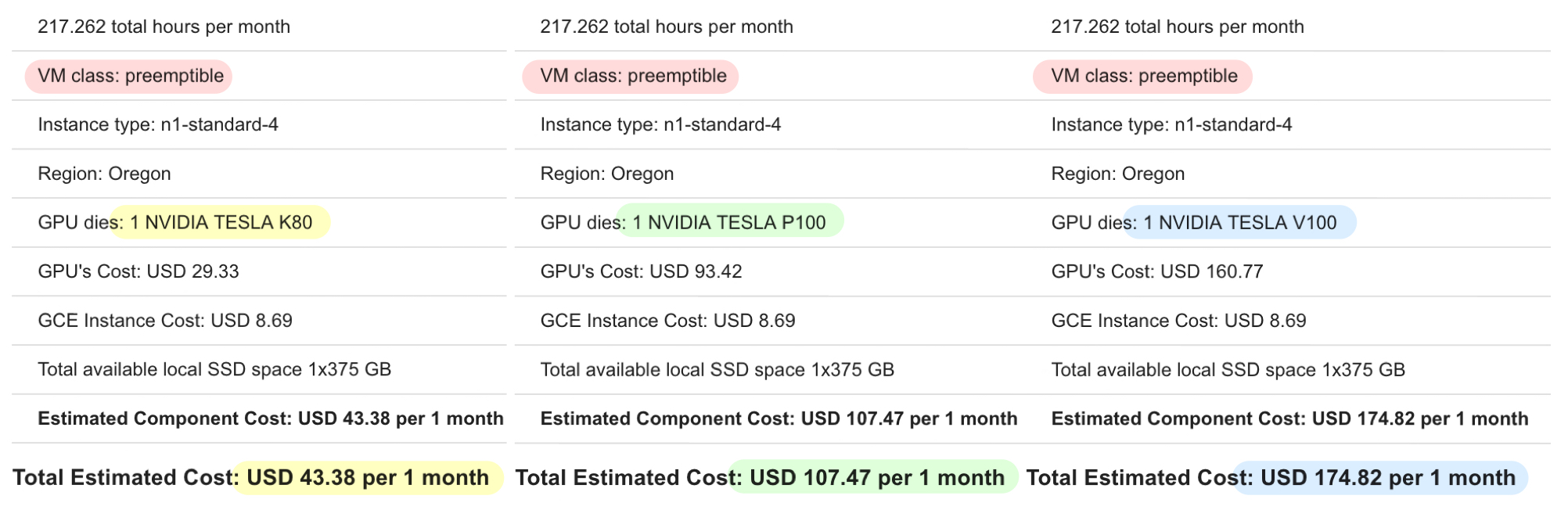 K80이 가장 저렴하면서 하위 모델이고, V100이 가장 좋은 모델입니다.